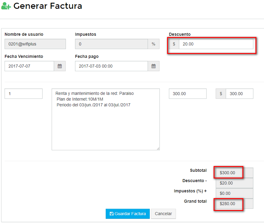 4Una vez aplicados los cambios, al generar la factura se aplicara el descuento.