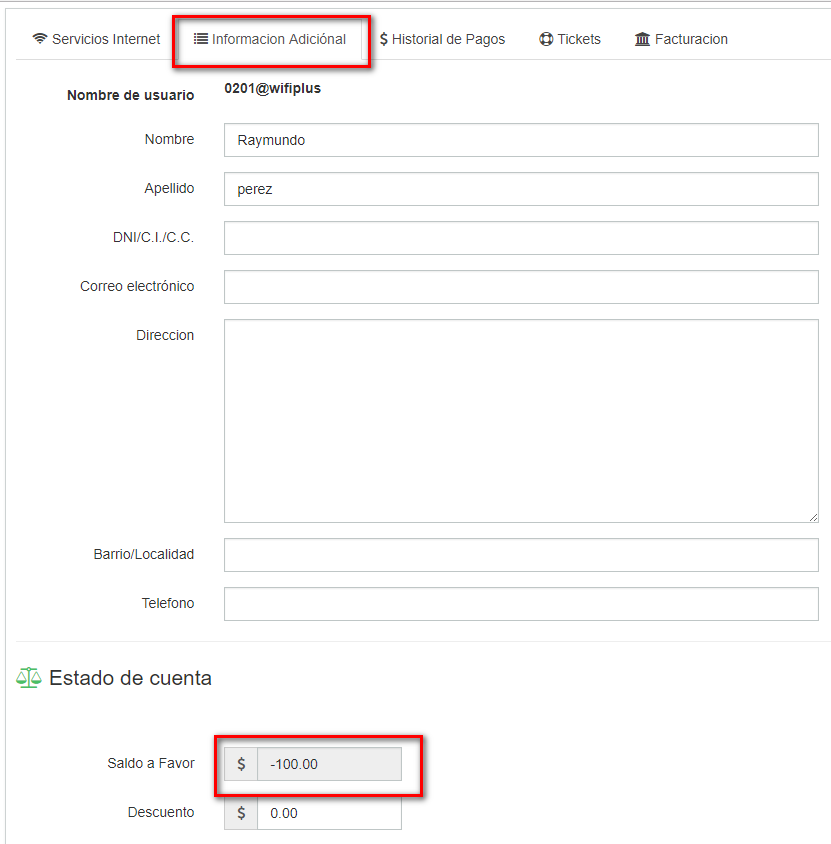 Otro ejemplo si el plan del cliente es de $450, se crea su factura de forma automatica, después viene y te adelanda 2 meses, entonces en total a apagar editamos los $450 y colocamos el doble $900, registras el pago y te saldrá la leyenda que de tiene saldo a favor de $450, que se usara y registrara de forma automartica el su proxima factura, considenrando que sigua teniendo ese plan de $450, porque si le pones otro plan de mayor precio, no se registrará.